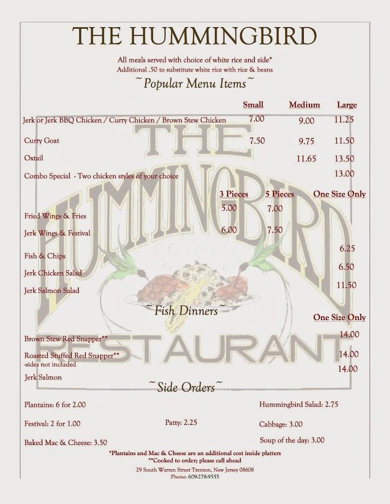 Welcome to The Hummingbird Restaurant, your go-to spot for authentic Jamaican cuisine in Trenton, NJ! Located at 29 S Warren St, we offer a cozy and relaxed ambiance perfect for solo dining, groups, or a casual lunch. Enjoy our delicious specialties like rice and peas, mac and cheese, and our signature stew chicken, all made with fresh, wholesome ingredients. With options for takeout, delivery, and dine-in, we cater to every craving. Whether you're a tourist or a local, our welcoming atmosphere and accommodating staff make dining with us a delightful experience. Join us for lunch or dinner – we can’t wait to serve you!